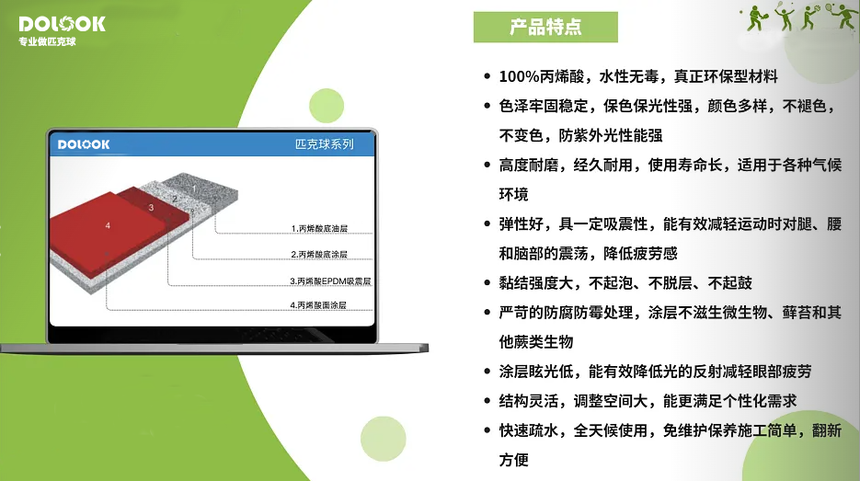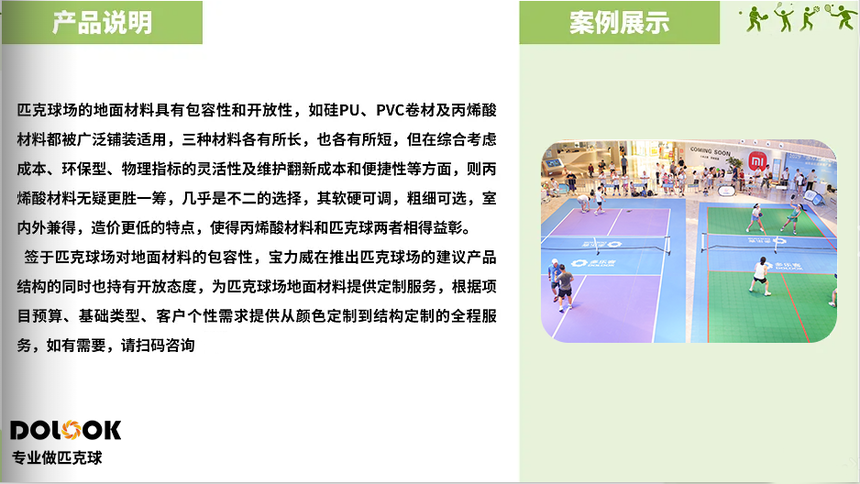 匹克球丙烯酸油漆本产品为高性能丙烯酸树脂涂料,专匹克球运动场地地面设计。具有优异的耐磨、耐候和抗紫外线性能,色彩持久鲜艳,附着力强,施工便捷。适用于混凝土、沥青等硬质基面,提供防滑、耐用的表面效果,符合环保标准,干燥快,使用寿命长。